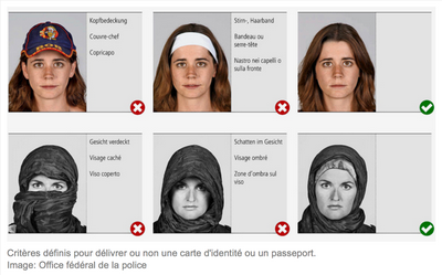 Sur un document de l'administration fédérale - l'Office fédéral de la police, plus précisément - intitulé "Critères d'acceptation des photos pour passeports et cartes d'identité", on découvre en page 4 que si un couvre-chef ou un bandeau sont interdits pour une femme d'apparence occidentale, un foulard entourant complètement la tête est en revanche admis pour une femme d'apparence orientale. Dans les commentaires, il est précisé que les couvre-chefs ne sont pas admis, sauf pour des motifs médicaux ou religieux attestés.